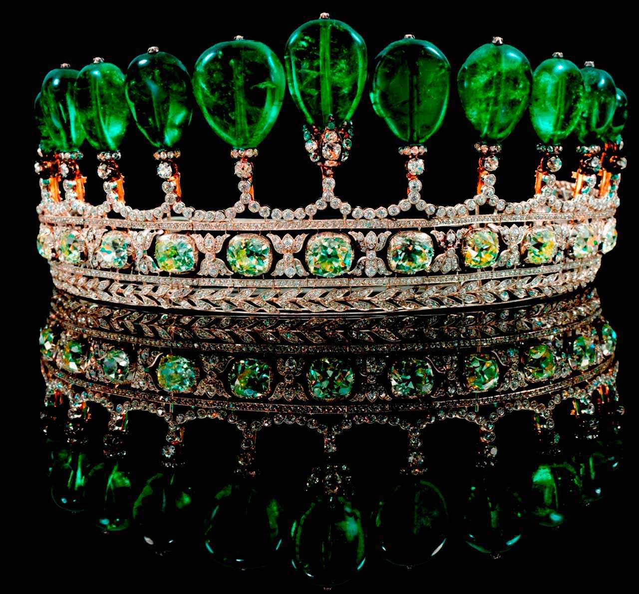 Тиара сделана из 11 редких каплевидных зелёных изумрудов и бриллиантов общим весом 500 карат.
