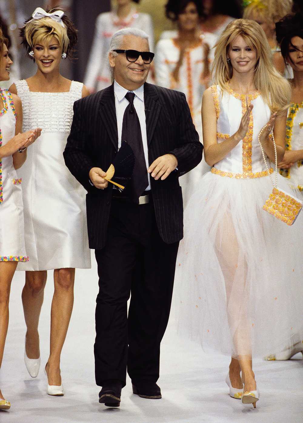 Карл Лагерфельд с моделями Линдой Евангелистой и Клаудией Шиффер на показе Chanel весна-лето 1996
