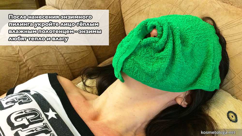 Перед пилингом необходимо очистить лицо с помощью очищающего молочка, пенки или геля для умывания. Затем нанести пилинг, 2-3 минуты слегка помассировать кожу кончиками пальцев, смоченными в теплой воде, а затем накрыть лицо теплым влажным полотенцем (помним, что энзимы любят тепло и влагу) и оставить пилинг на лице на 10-20 минут, в зависимости от того, как указано в инструкции к вашему энзимному пилингу.