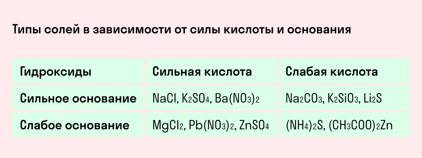 Важное условие гидролиза — наличие в составе соли слабого иона. В зависимости от того, какие соли подвергаются гидролизу — со слабым основанием или слабой кислотой, в итоге может получиться кислая, щелочная или нейтральная среда водного раствора