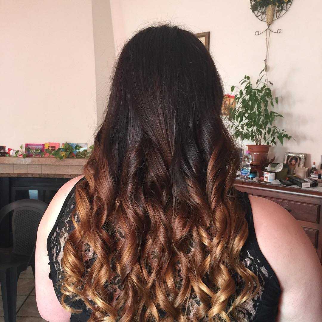 - Карамельный балаяж — подходит для брюнеток и черноволосых красавиц. Карамельные блики, в частности, имеют натуральный цвет.