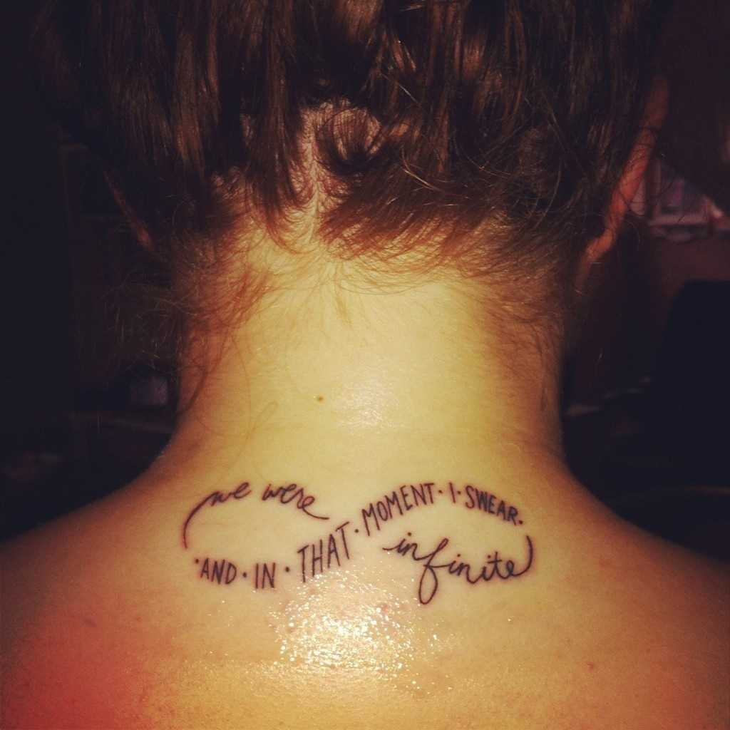 - Бесконечность с составляющими из пера и надписи. Обладателя такой татуировки можно назвать не просто ранимым, но и очень душевным человеком. Перо олицетворяет легкость и свободу, а в совокупности с символом вечности – постоянную тягу и поиск свободы. Такое тату отлично подходит творческим людям.