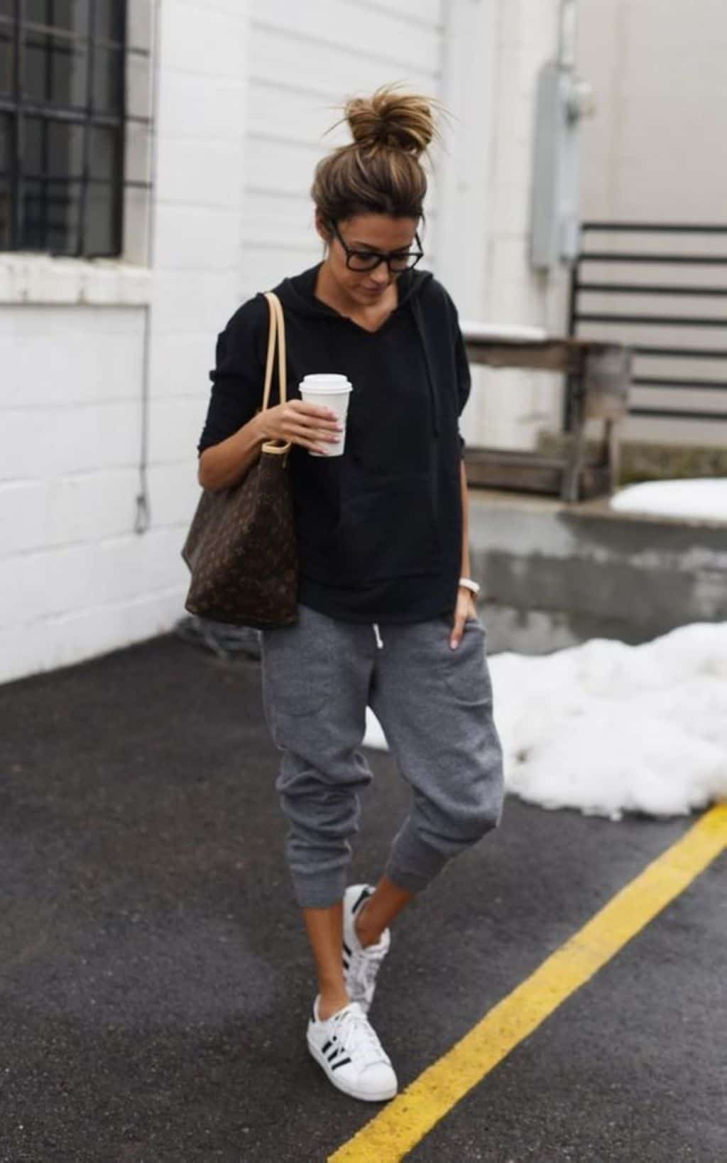 Модницы носят тренировочные брюки с пальто и пуховиками, если нужно утеплиться, а также с объемными свитерами, кардиганами, свитшотами оверсайз и ультрамодными джинсовыми куртками в оригинальном дизайне.