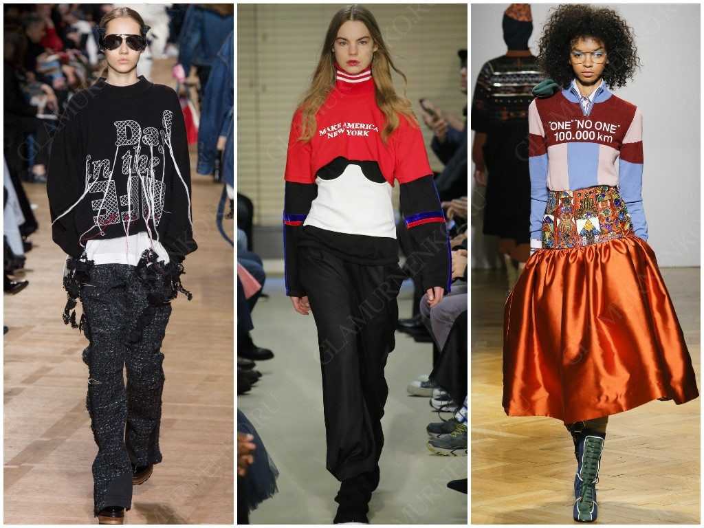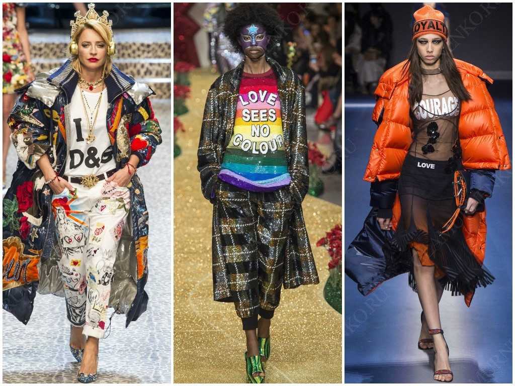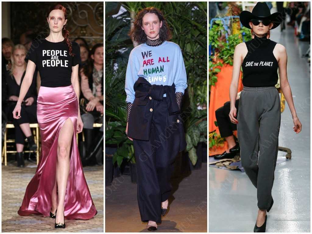 Скажите это громко, произнесите это чётко и сделайте это, в первую очередь, с помощью вашей одежды. В моде разнообразные девизы и слоганы, апеллирующие абсолютно к любым сферам жизни: от политики до этики и морали. Несмотря на очевидную иронию, отнеситесь к данному тренду со всей серьёзностью. Выбирайте надписи на одежде, отражающие вашу жизненную позицию и отношение к обществу.