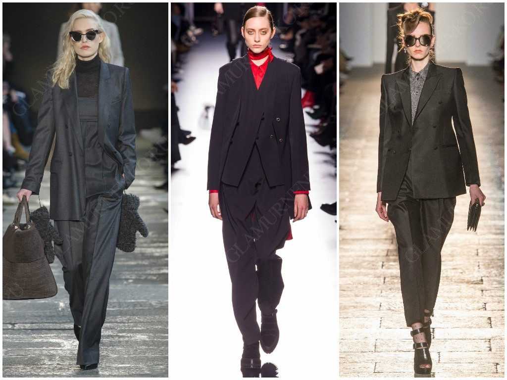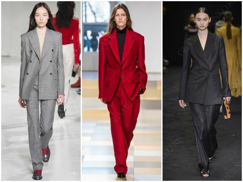 В первую очередь обратите внимание на power suits – деловые костюмы с отсылкой к 90-м, с пиджаками оверсайз и широкими брюками в мужском стиле. Вторыми в списке идут ансамбли, состоящие из юбки с блузкой – здесь фантазия дизайнеров разыгралась на полную, предложив нам оригинальные варианты, полностью ушедшие от традиционных «белая рубашка + чёрная юбка-карандаш»