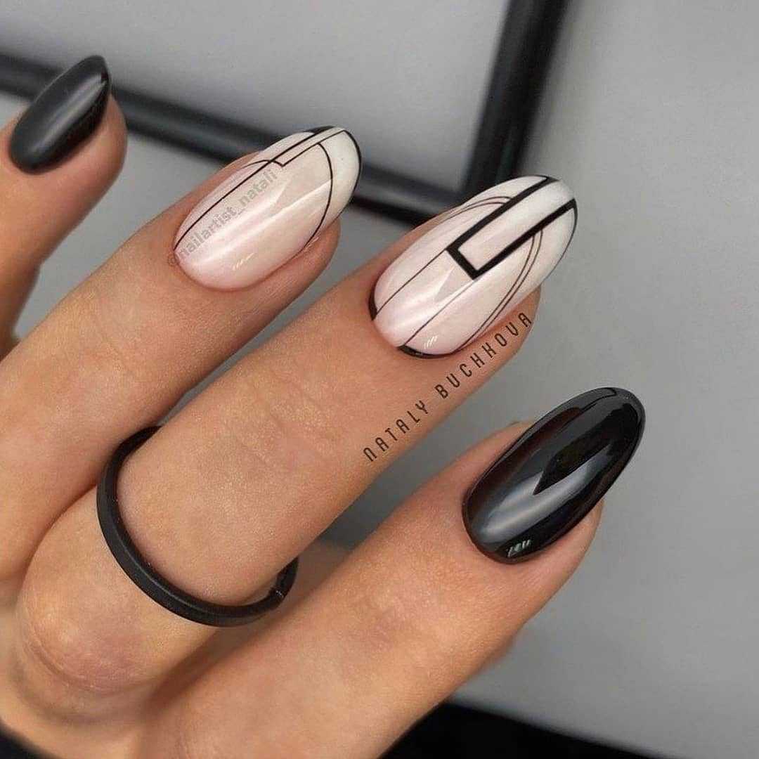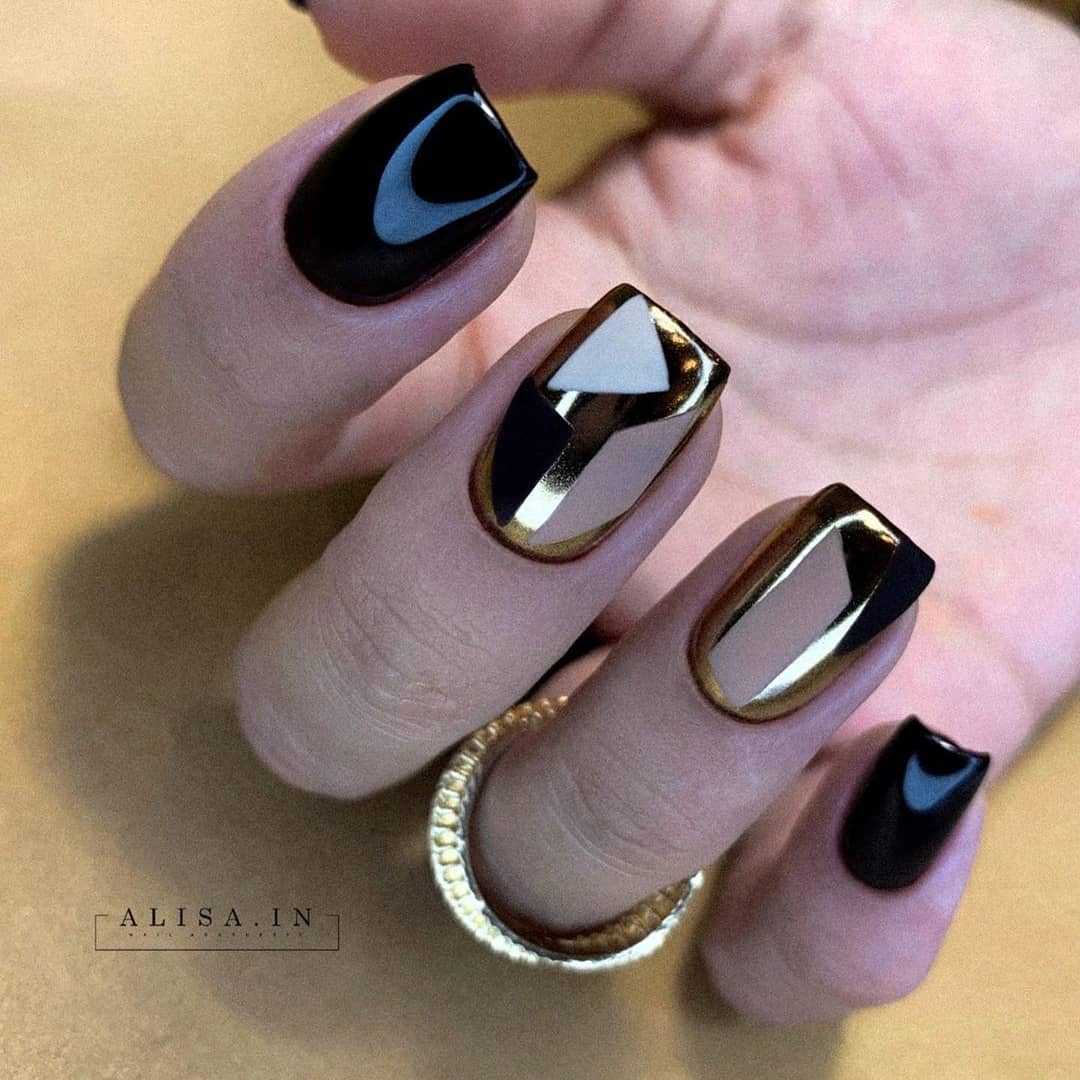 Необычный дизайн великолепно смотрится на коротких ногтях. В предстоящем сезоне на пике моды будет черный маникюр, с геометрическим рисунком. С таким оригинальным дизайном ногтей можно ходить даже на работу.