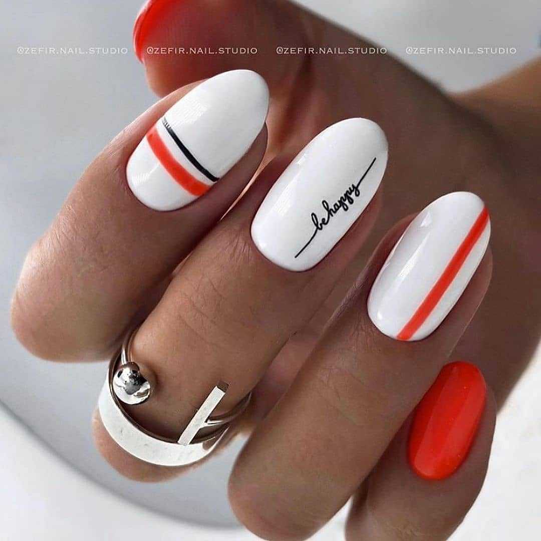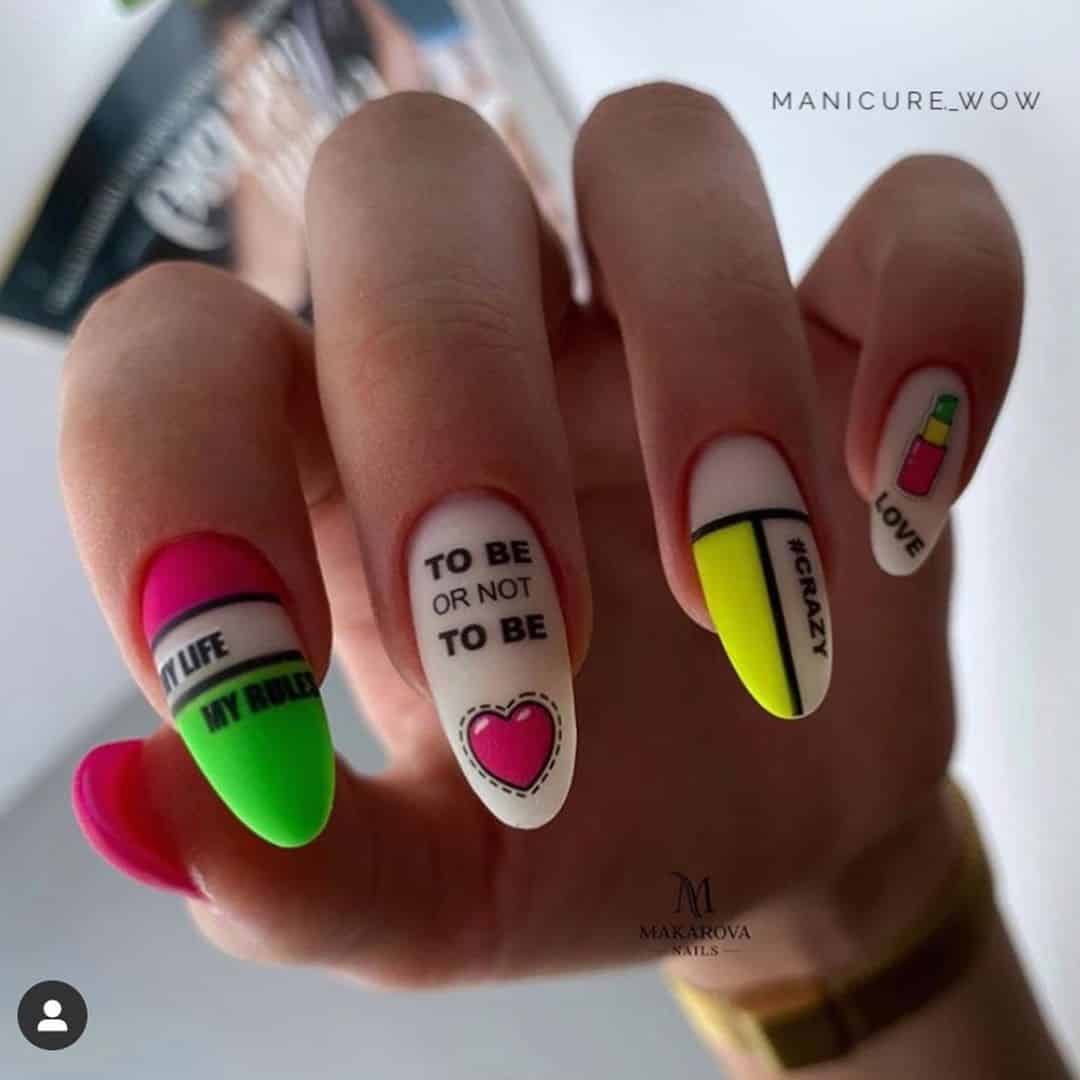 Для полного и максимально точного понимания ситуации рассмотрим и этот вариант. Тем более, он достоин вашего пристального внимания не меньше других. Охарактеризовать его хочется самыми яркими терминами, доминируют среди которых «не скучный», «динамичный», «позитивный», «яркий». На ваших пальчиках вполне могут расположиться как абстрактные буквы, так и вполне осмысленные слова или фразы, в итоге получается не просто стильно, а ультрамодно. Свободные от надписей пластинки получают яркую основу, а вот надписи располагаются на нейтральном фоне