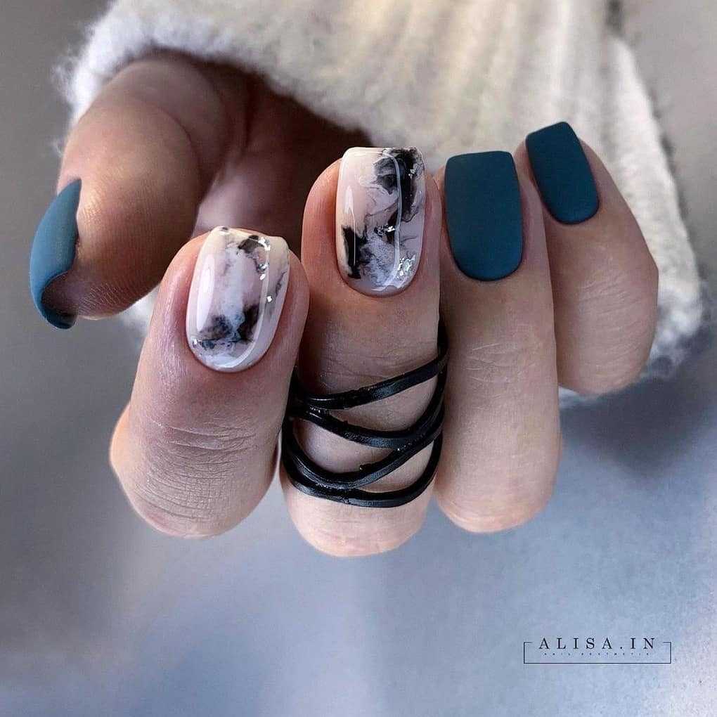 Женщины, ищущие более элегантный стиль, могут использовать классический белый цвет в сочетании с геометрическими узорами, которые идеально смотрятся на ногте, или сочетать оттенок темно-синего с нежными блестящими частицами. При выборе дизайна матовых ногтей ориентируйтесь в первую очередь на собственное настроение и характер.