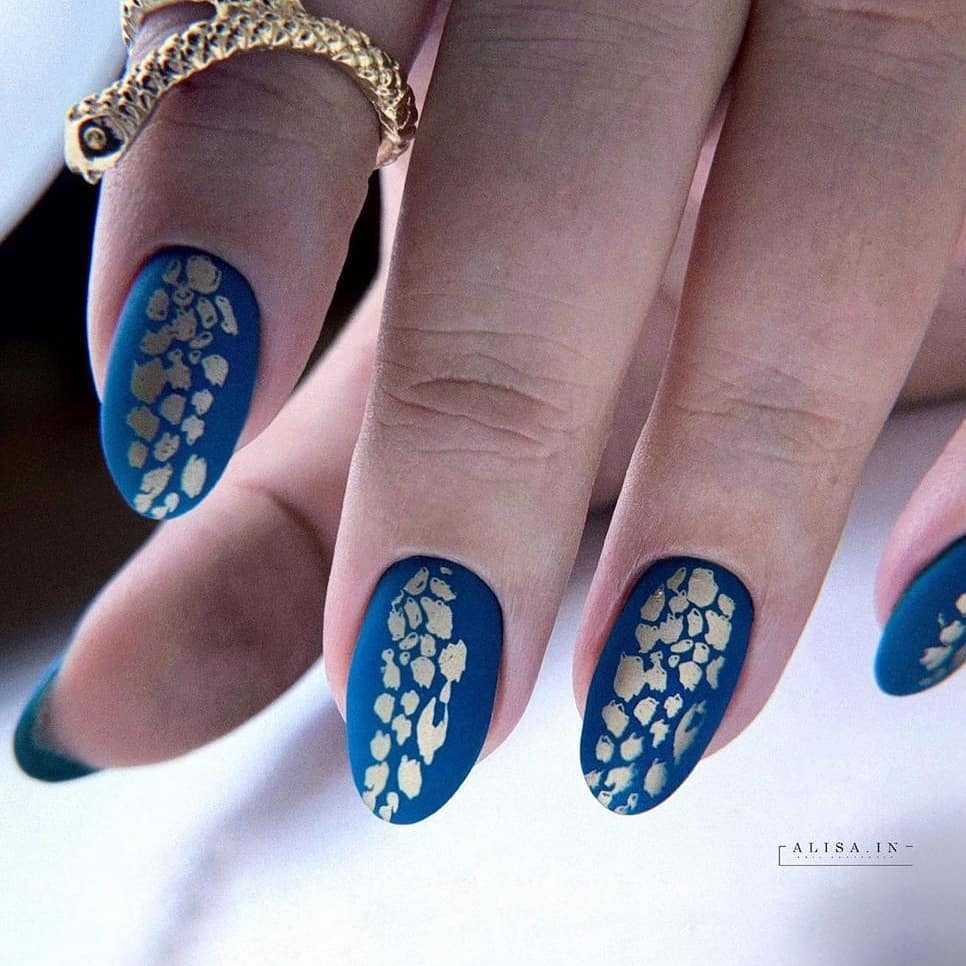 Острые, миндалевидные, форма балерина – полотно, на котором можно создавать действительно шедевральные работы синего цвета в матовом исполнении. Лучшие идеи для маникюра на длинных ноготках: