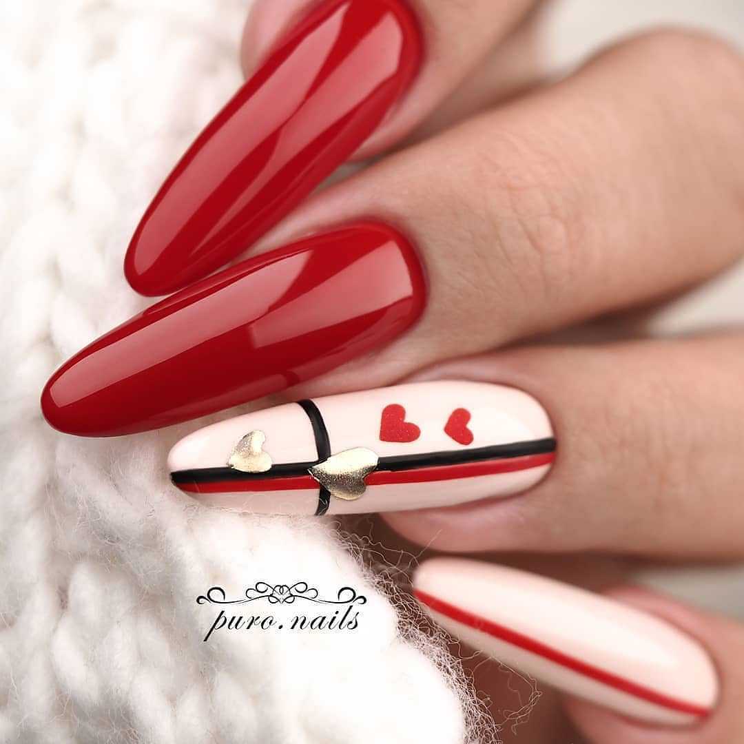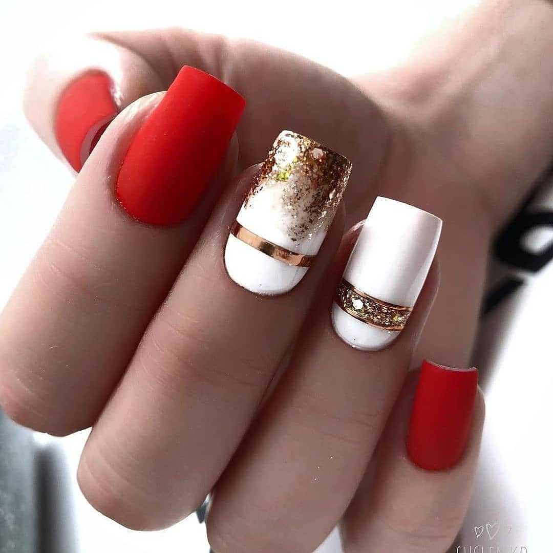 Выбирать подобный цвет можно в том случае, если вы решили сделать френч. Самым беспроигрышным и захватывающим вариантом будет красный матовый маникюр с лунками.