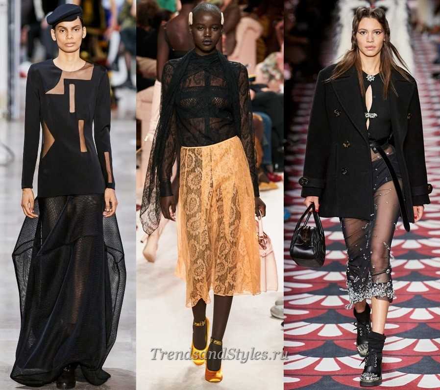 Не сезонным, но при этом невероятно актуальным трендом остаются прозрачные юбки. Не могут дизайнеры отказаться от таких воздушных одежд и на холодный сезон. Гипюр, кружево, сетка встречается как в праздничных, так и повседневных образах.