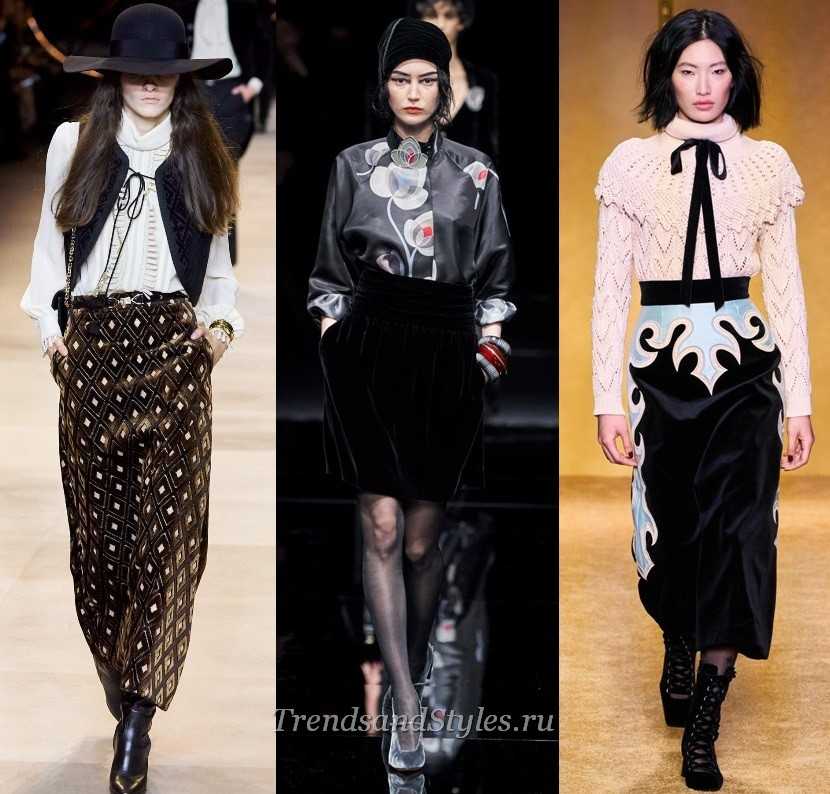 Нарядный и теплый велюр — символ холодного сезона. Не забывайте и юбках из этого благородного материала. Дизайнеры дополнительно украшают дорогую ткань вышивкой, нашивают кристаллы, комбинируют с другими фактурами, как у Celine, Giorgio Armani, Zimmermann.