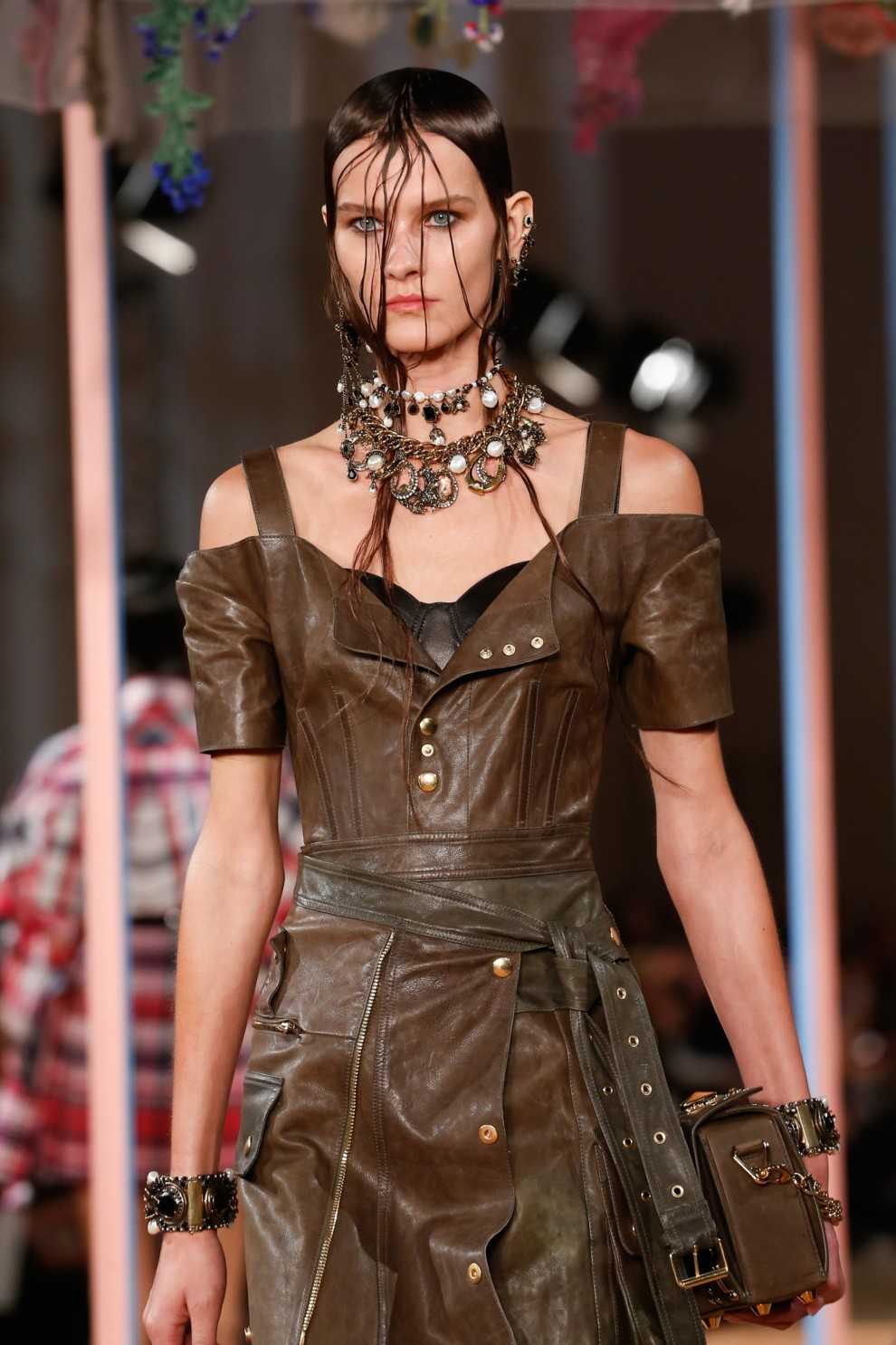 - Брутальность. Ожерелья из кожи и замши, украшенные шипами, заклепками, монетами и другой металлической фурнитурой. Также в фаворе широкие кожаные модели, напоминающие ошейник для собак, украшенные свисающими цепочками в виде треугольника;