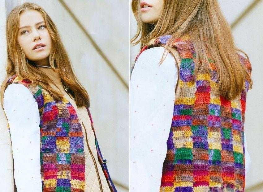 Вязаный крючком пэчворк в одежде смотрится очень колоритно, фрагменты можно делать пестрыми или максимально ажурными, плотными или полупрозрачными: