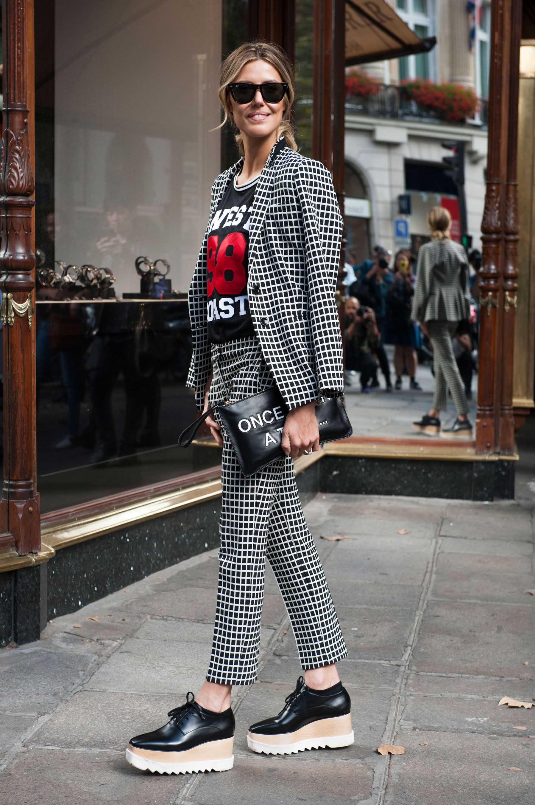 Пайетки, стразы и прочая мишура — слишком дерзкий вариант? Возьмите одну пару монохромных брюк серого цвета, добавьте кирпичного цвета верх, смешайте с нейтральными аксессуарами — и вуаля, пирог готов. Точнее, модный образ с клетчатыми брюками 2019 года.