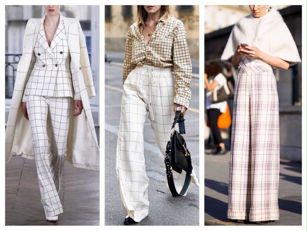 Белоснежные клетчатые штаны популярны среди молодежи. Рисунок и белый цвет делают фигуру изящной, а образ стильным. Клетка черная или синяя, реже зеленая. В моде «куриная лапка», рапица или классическая клетка.