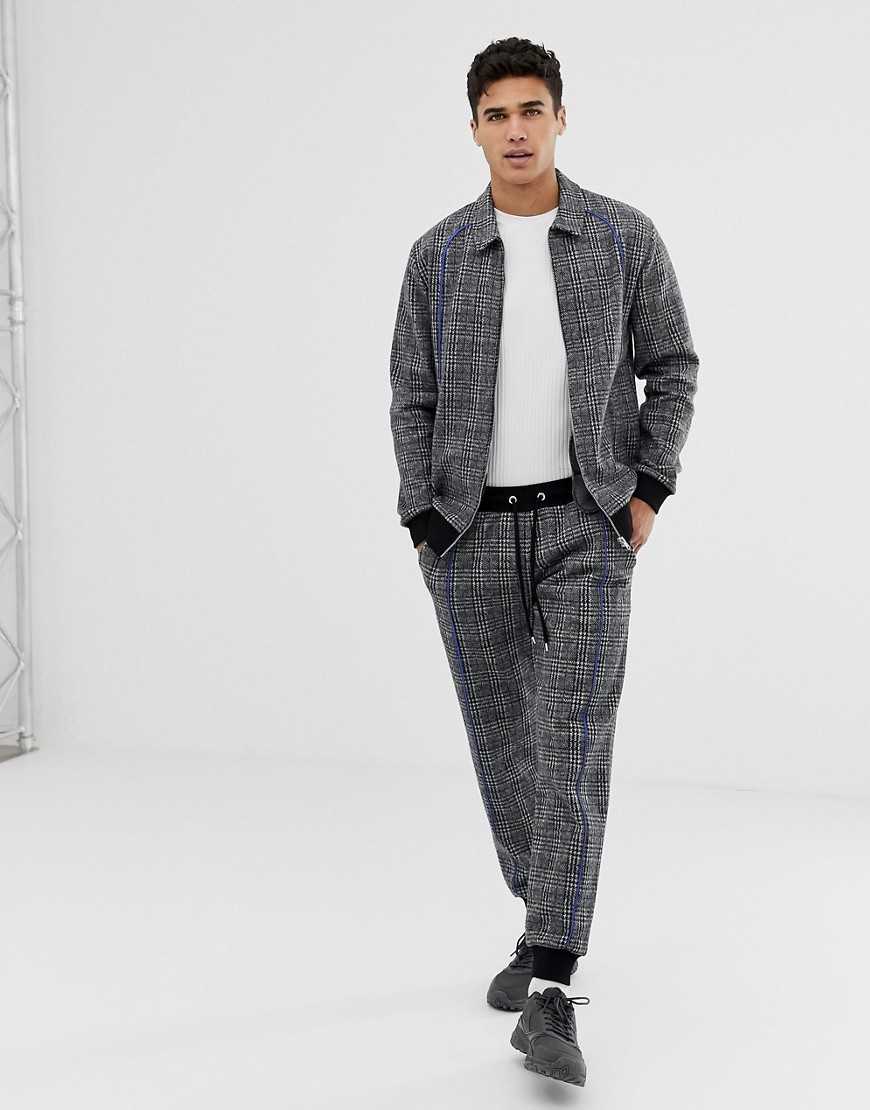 - Скинни, джогеры. Это — модные зауженные фасоны мужских брюк 2020 года. Модели с мелкой клеткой приглушенных тонов уместны в деловом гардеробе. Вызывающий шахматный или крупный монохромный узор на сужающихся к лодыжкам свободных джогерах с кроссовками и однотонным бомбером или толстовкой составят яркий спортивный стиль. Облегающие скинни темных тонов с блейзером или пиджаком — удачный повседневный образ.