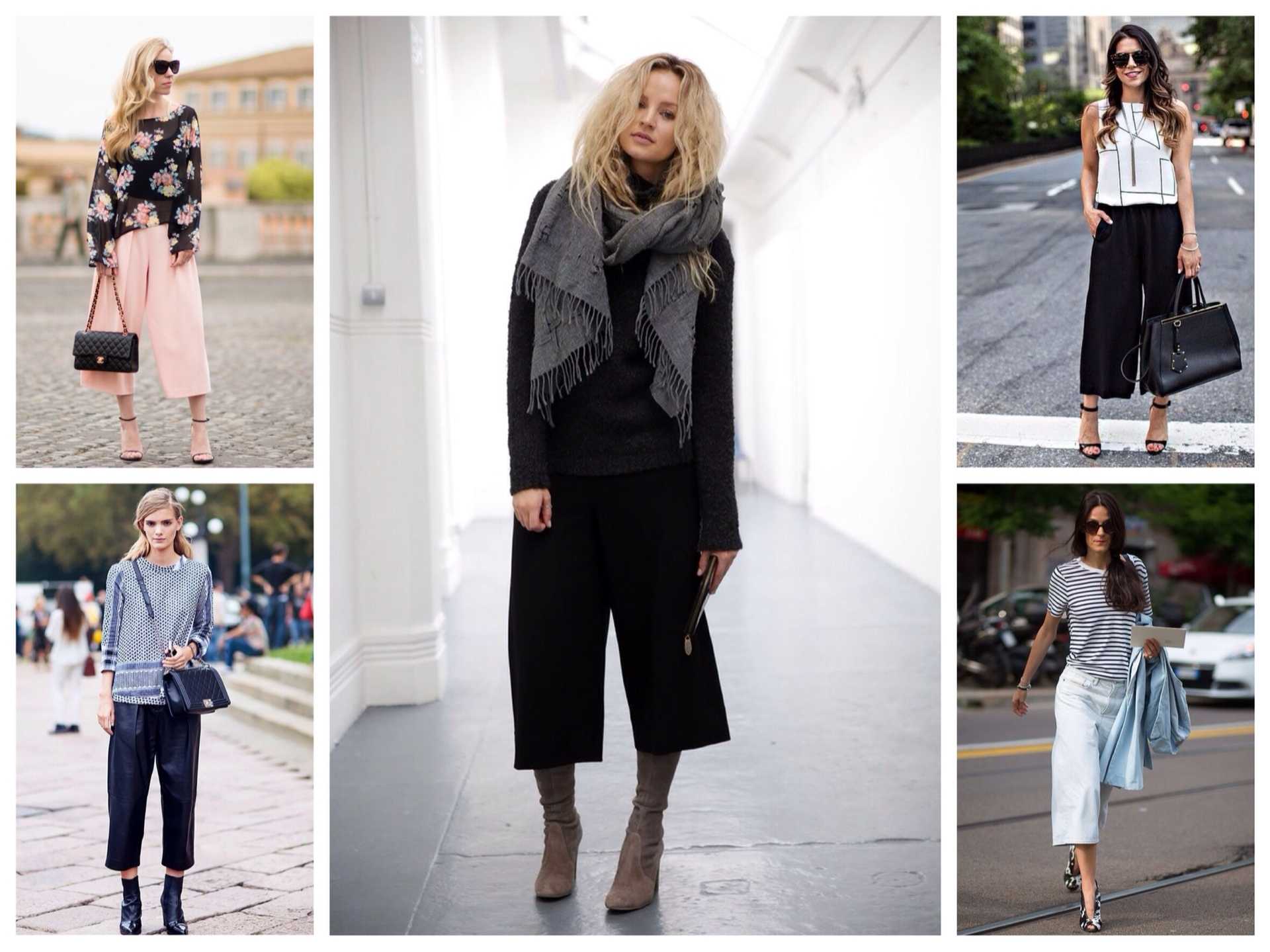 Укороченные брюки. Оканчиваются посередине икры либо на два пальца от щиколотки. Первые носят название «капри», вторые — 7/8. Вариантов моделей несколько: чинос (со свободным кроем, защипами, боковыми карманами), кюлоты (с высокой талией, максимально широкими штанинами), бриджи (длиной чуть ниже колена, прямые или чуть зауженные, но со свободным кроем). Подходят такие брюки длинным стройным женщинам. Девушкам невысокого роста стоит подбирать длину 7/8, туфли-лодочки (или босоножки) на каблуке.