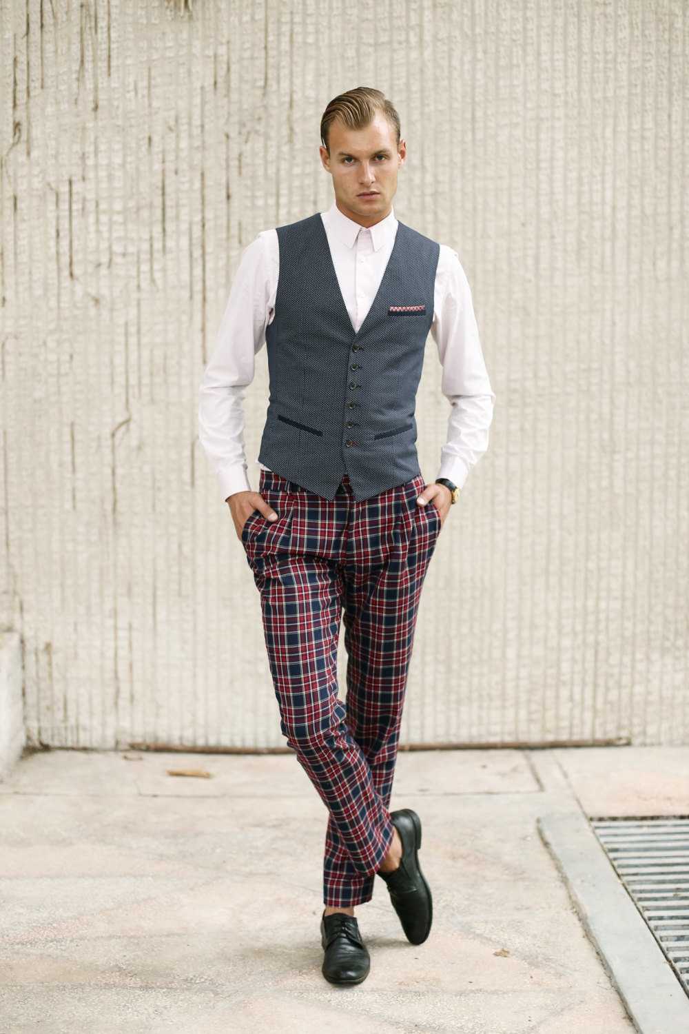 Брюки-скинни охотно носят молодые мужчины. Наличие контрастной клетки подчеркивает приверженность неформальному стилю и обязывает носить вместе с брюками одежду умеренного дизайна.