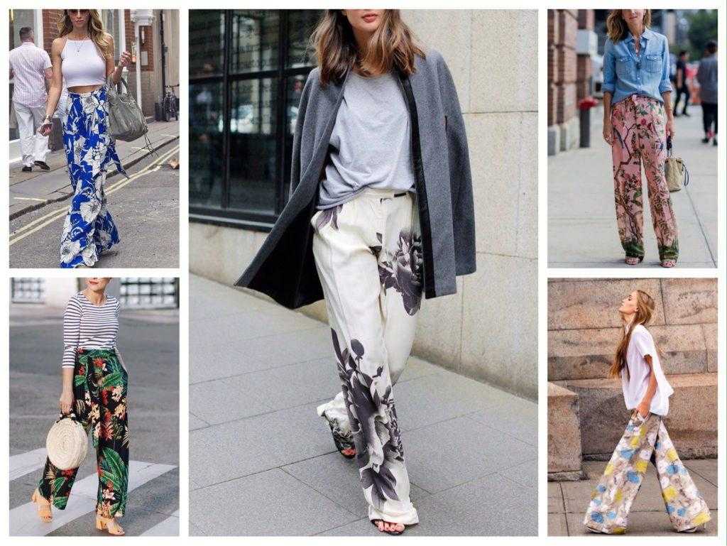 Палаццо с принтом встречаются не реже, чем однотонные. Обычно рисунок изображает геометрический узор, цветы, животных и птиц. Он чаще крупный, чем мелкий, обычно яркий. Чтобы носить такие брюки и не казаться при этом пестрой, нужно строго придерживаться основного принципа сочетаемости: чем ярче и заметнее принт на одной части одежды, тем меньше его должно быть на другой.