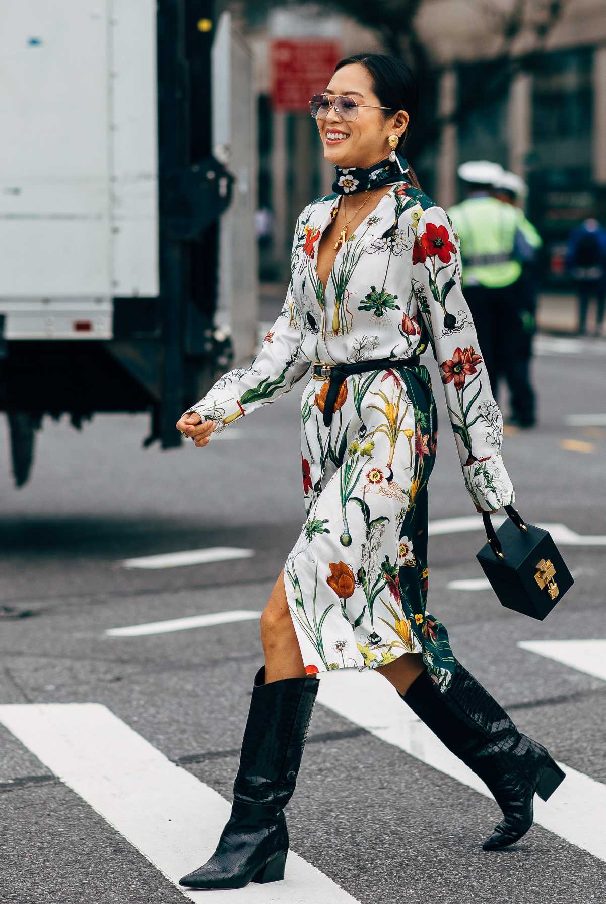 Это самое красивое сочетание с сапогами в ковбойском стиле, какое только может быть. Особенно хорошо с ними смотрятся летящие силуэты, например, модели из шифона. Самая актуальная (и при этом удобная) длина — миди.
