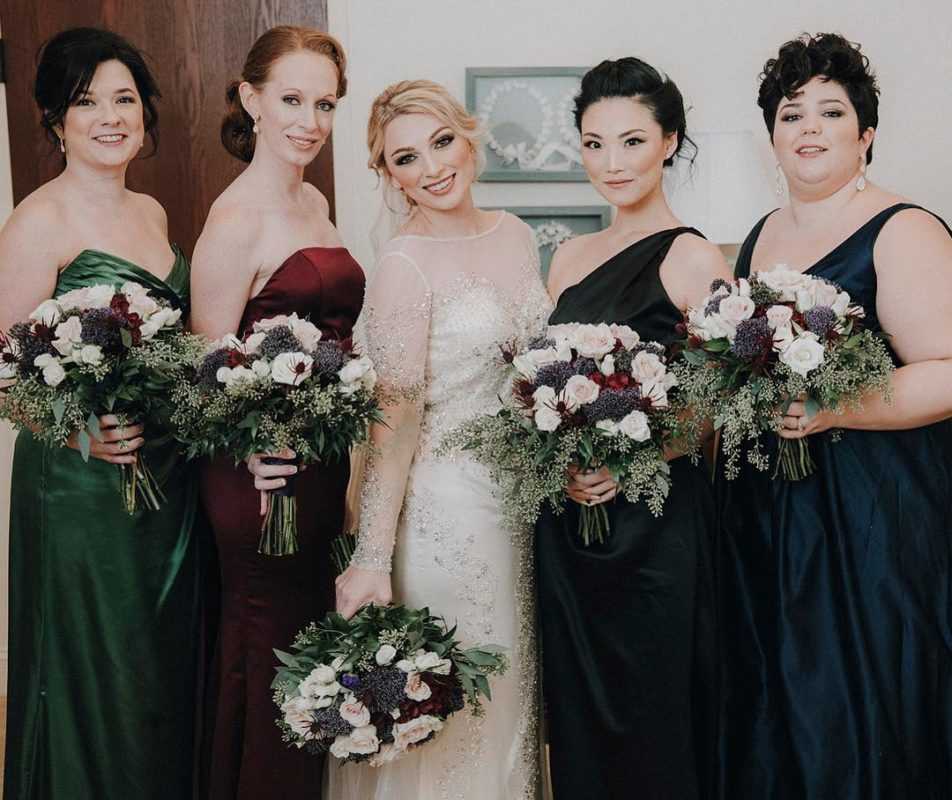 Зимой эффектно выглядят свадебные платья глубоких, насыщенных цветов (бордо, индиго, лиловый).