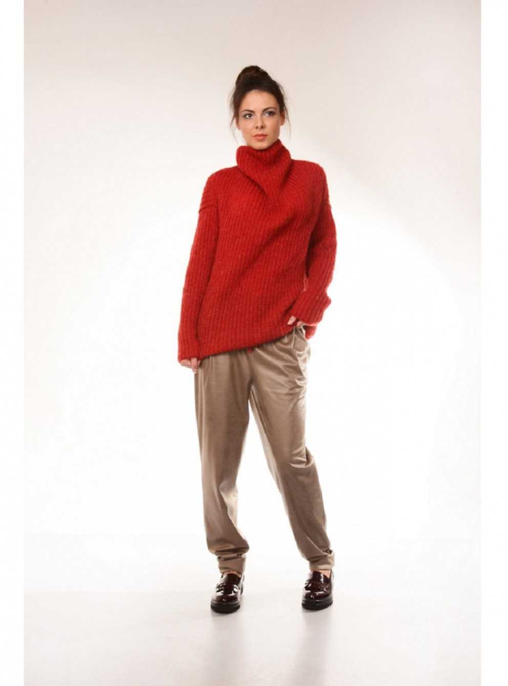 Свитер — вязаная одежда, чаще всего из толстой пряжи, без застежек. Средняя длина — до бедер, однако популярны как укороченные, так и удлиненные модели. Главная черта — высокий закрывающий шею ворот. Может быть двух- или трехслойным. О том, с чем носить вязаный женский свитер поговорим дальше.