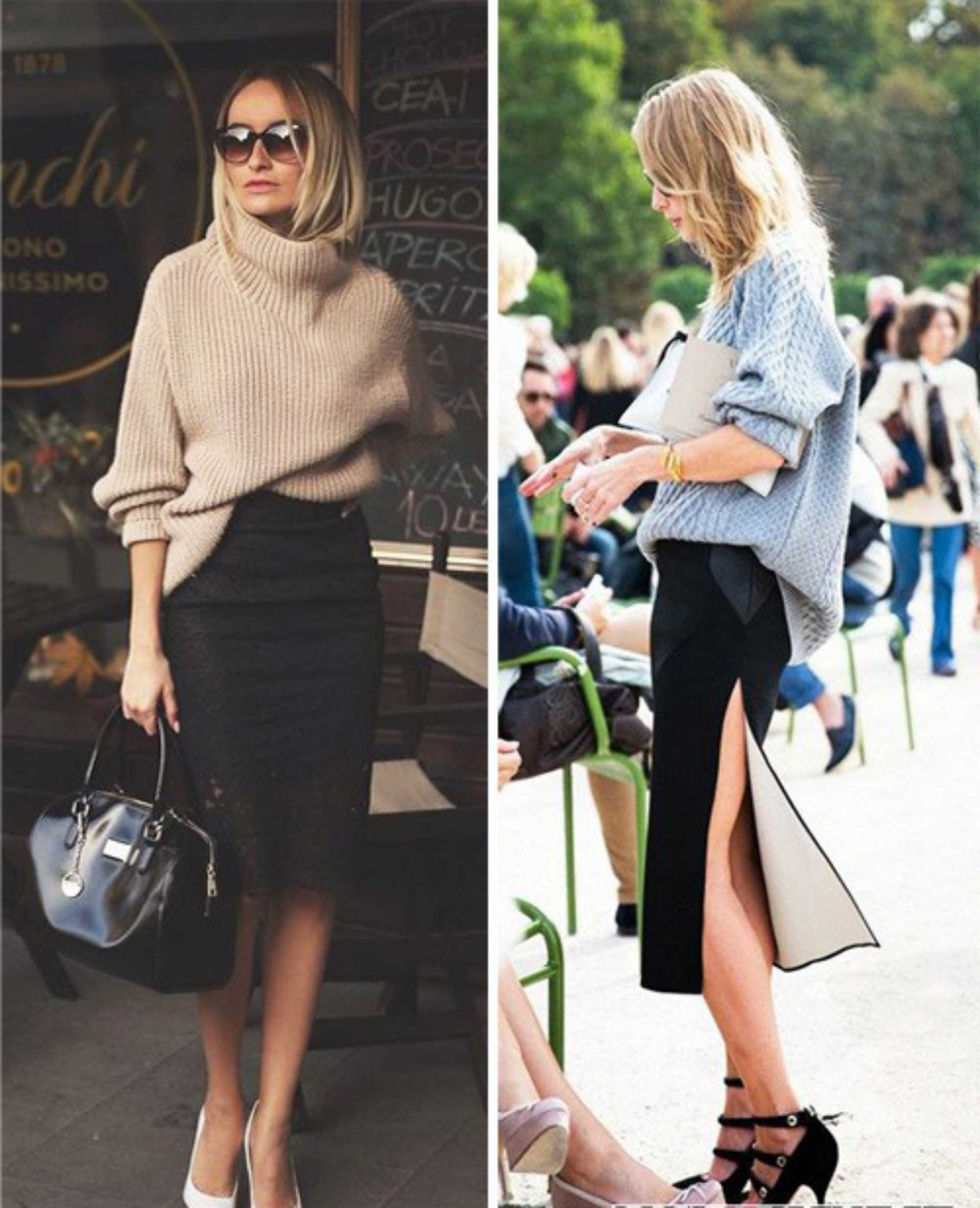 Модный стильный образ дает сочетание свитера крупной вязки с юбкой. Длина и модель юбки зависит от ситуации. Например, офисный дресс-код предполагает миди, строгие юбки-карандаши или просто узкие юбки без намека на сексуальность.