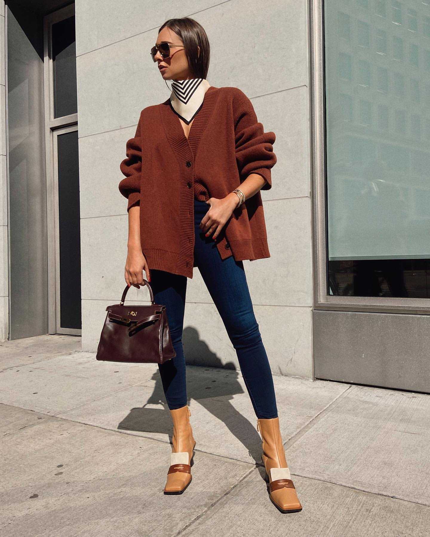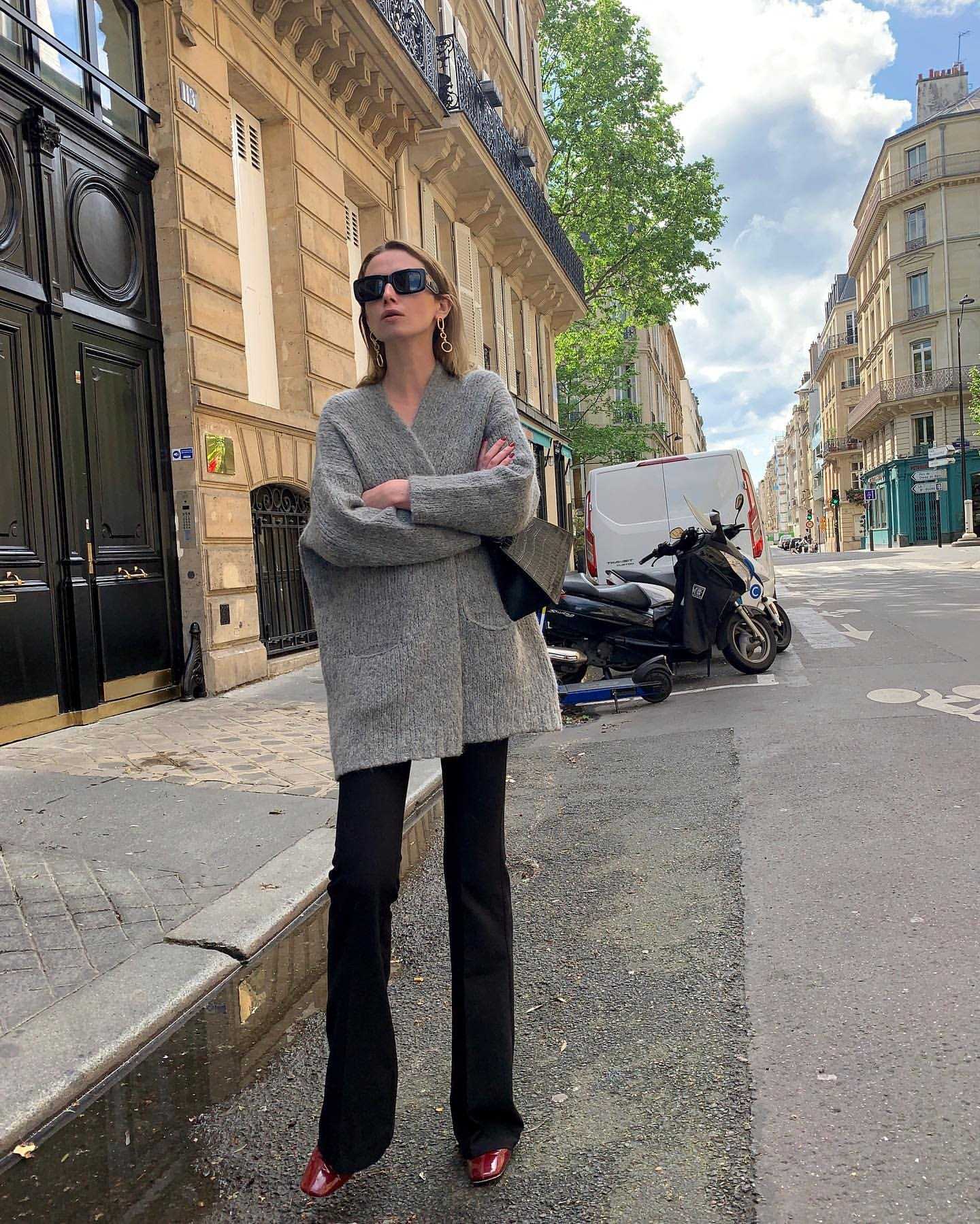 Связка текстурой (сумка-обувь) и формой (очки повторяют квадратную форму кардигана). Photo: @ solenelara