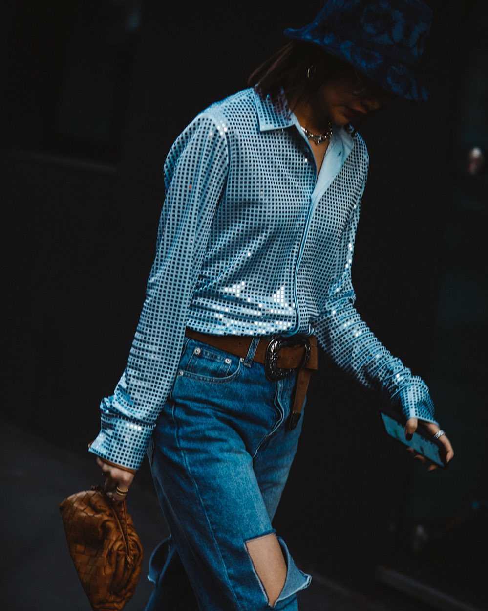 Связка колье-пряжка ремня (фактурный металл) + контрастные доминантной голубой гамме образа ремень и сумка-пошетт коньячного цвета. Photo: Sandra Semburg