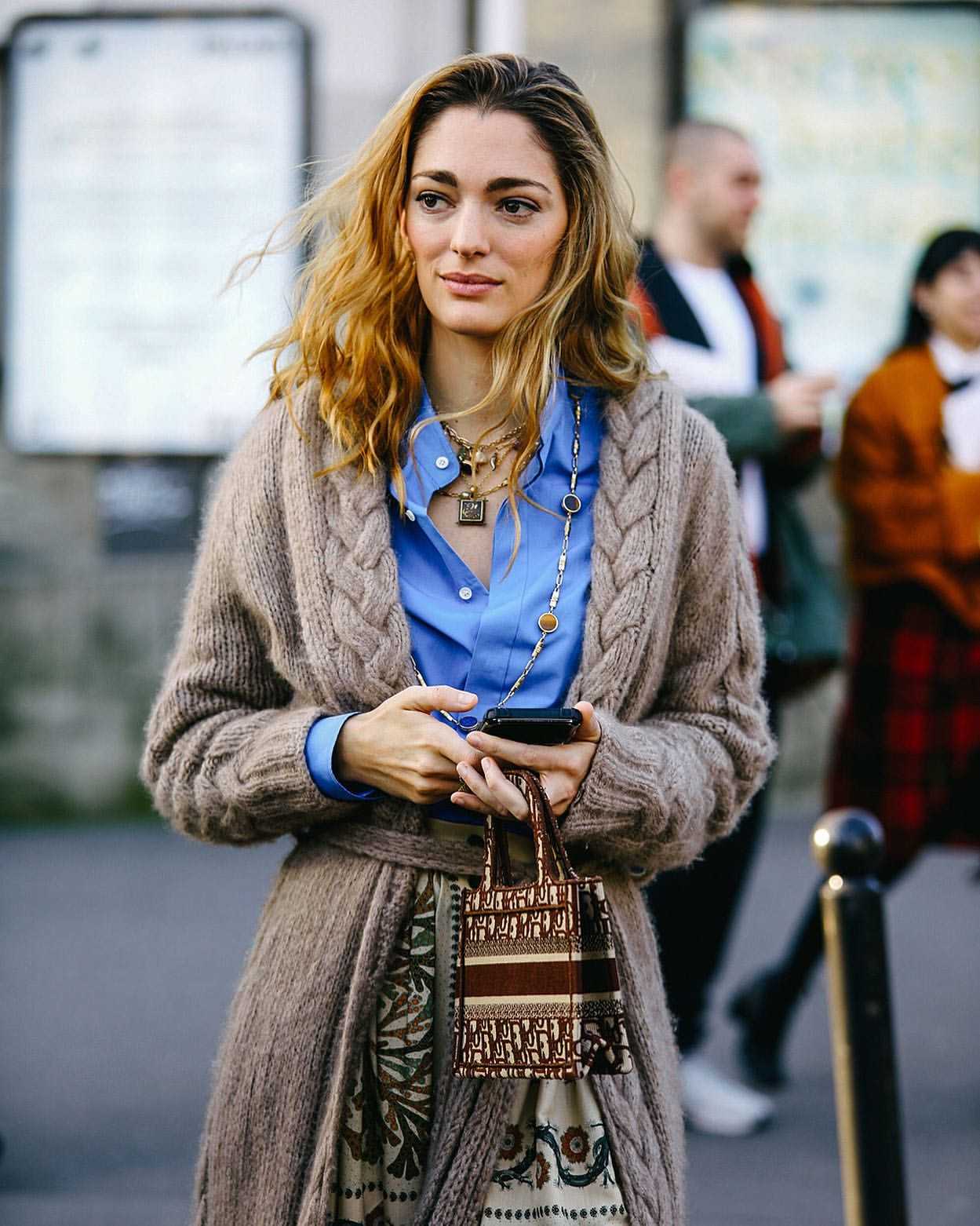 Связка бохо-идеей (бижутерия, кардиган, сумка и даже небрежная укладка на фоне базовой голубой рубашки). Photo: Sandra Semburg