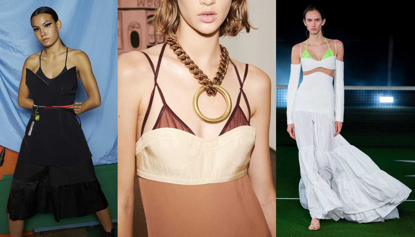 Еще одна особенность белового стиля весна-лето 2021 -выглядывающие из-под одежды топы-бюстье на тонких бретелях или их имитация.