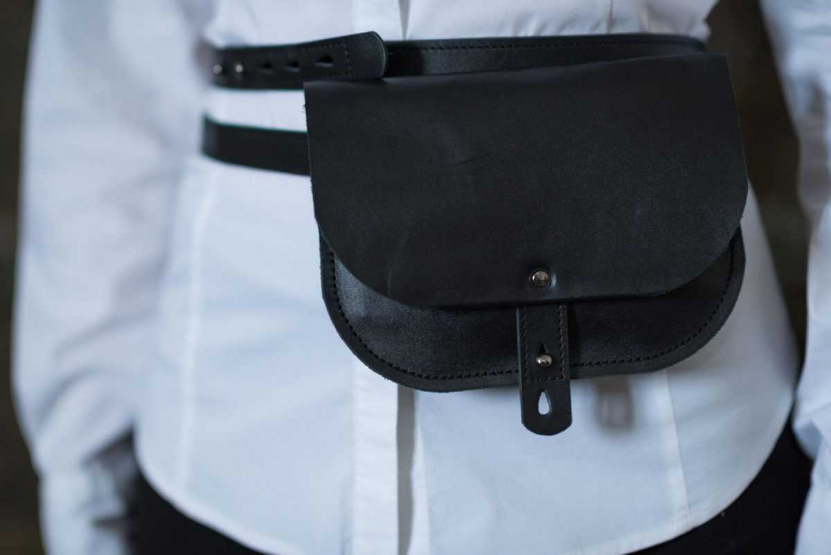 - На поясе. Классический вариант, удобный и практичный. Освобождает руки и позволяет всегда контролировать ценные вещи.