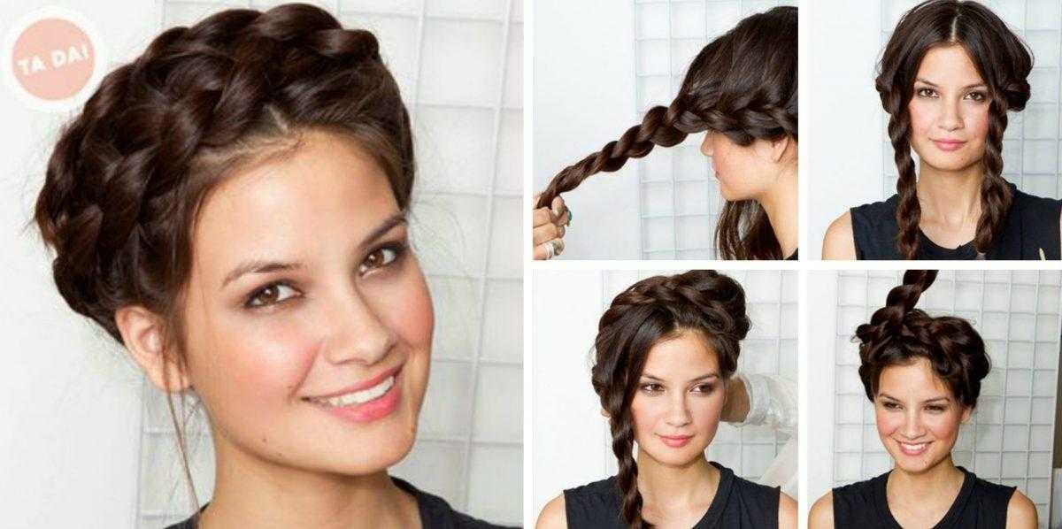 Неширокую трехпрядную косичку заплетают у затылка либо возле виска, оборачивают ею голову надо лбом, направляют к противоположному уху, фиксируют в нескольких местах невидимками.