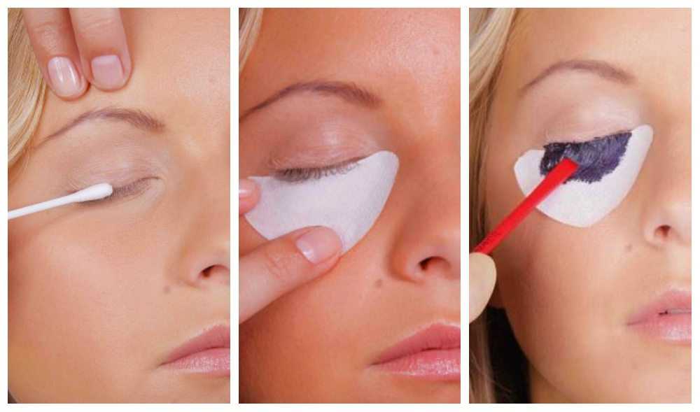 - Под нижнее веко подложите специальные бумажные патчи или половину ватного диска, чтобы случайно не испачкать кожу при окрашивании.