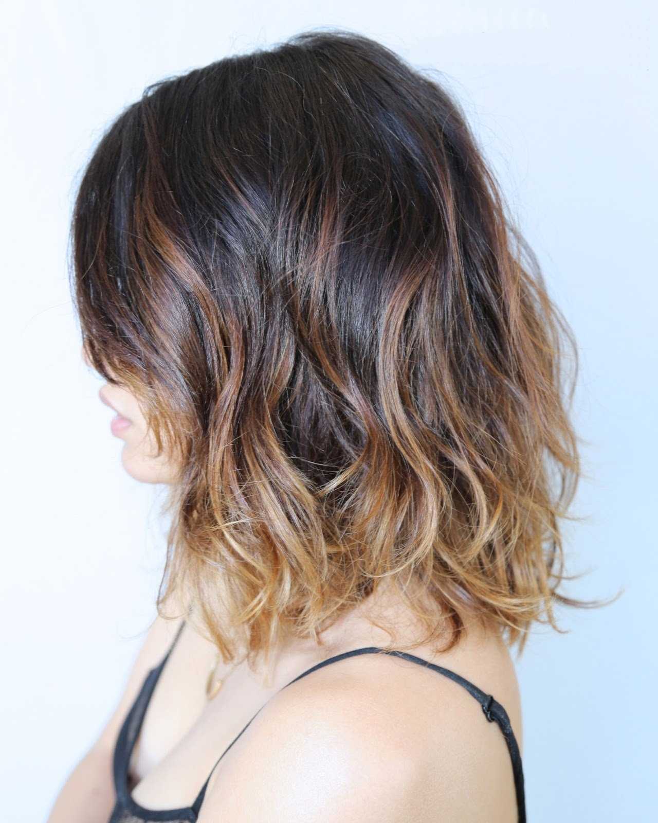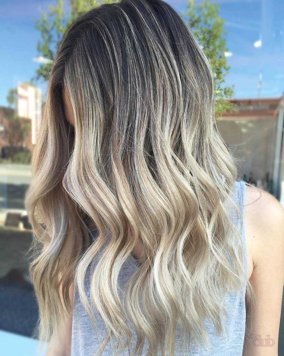 Плавные перепады оттенков проходят по вертикали и напоминают природное выгорание на солнце. Тёмные корни часто сочетаются со светлыми кончиками. Используются только натуральные цвета. Это делает волосы визуально объемнее и освежает облик.