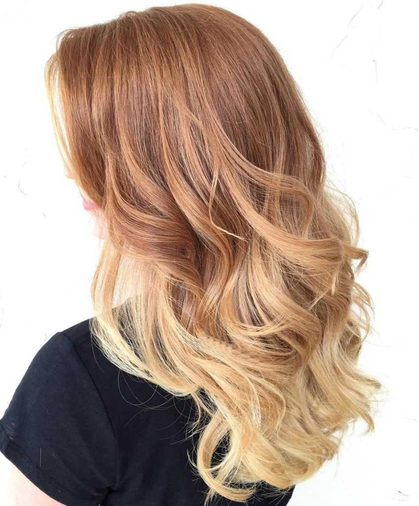 Рыжие тона стоит использовать, если исходный цвет ближе к теплому. Переход может начинаться как у корней, так и уже ближе к кончикам.