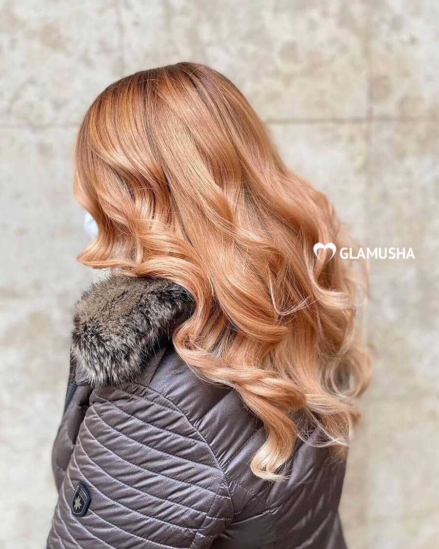 Такая необычная техника окрашивания волос также популярна в 2021 году. Светлые волосы с красивым апельсиновым оттенком — модная вариация для блондинок.