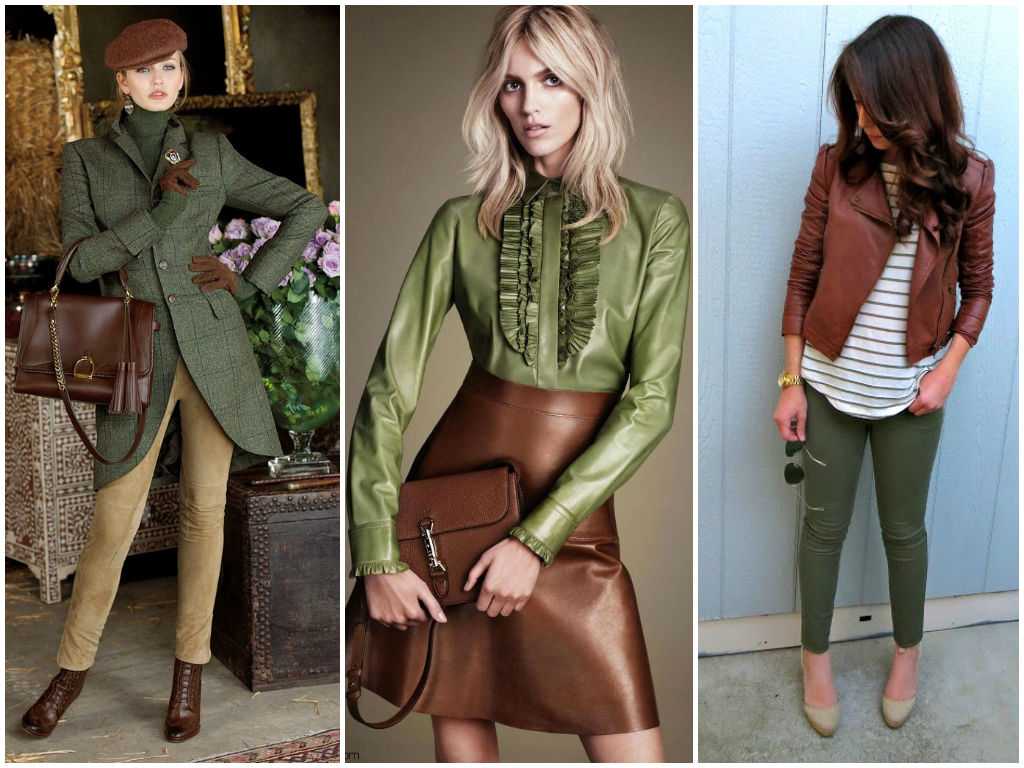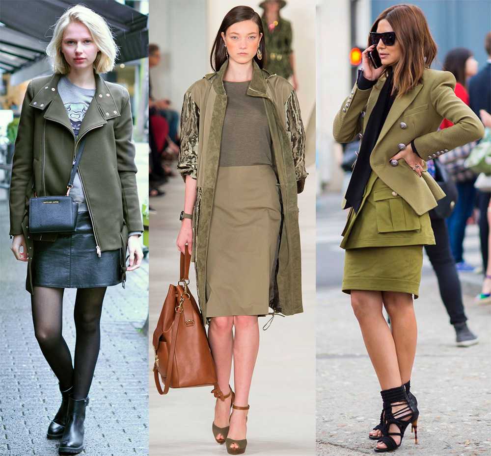 Модным направлением при создании образов является использование в одном наряде нескольких оттенков одной палитры. Болотный не стал исключением, поэтому его можно комбинировать с любыми зелеными, золотисто-коричневатыми тонами. Такое сочетание прекрасно подходит для стиля милитари. Кроме того, модницы дополняют им образы в стилях: