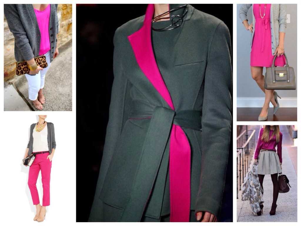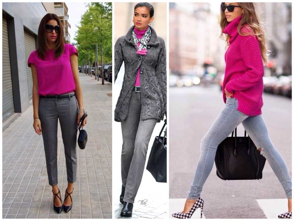 Это сочетание совершенно беспроигрышно. Например, очень элегантно выглядит такая комбинация, как блузка цвета фуксии и серые брюки-галифе.