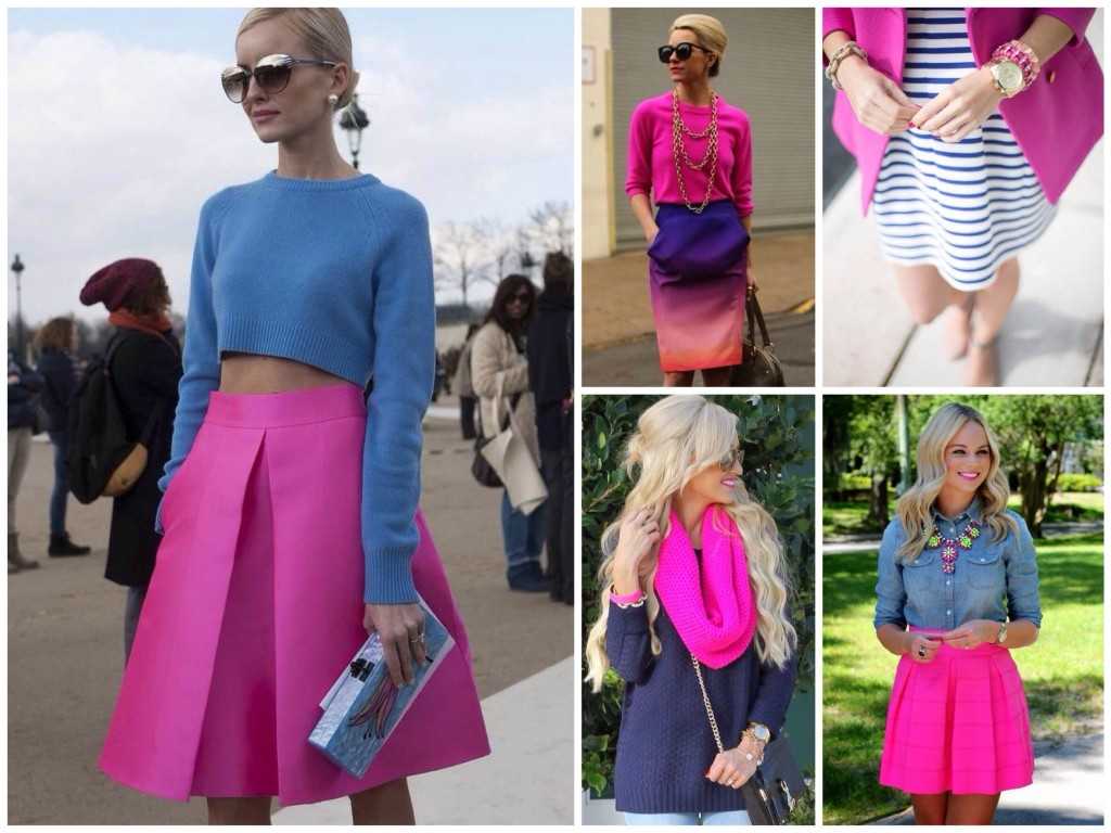Сочетание этих цветов может показаться вам весьма неожиданным, но оно выглядит довольно эффектно при правильной подаче. Расклешенная синяя юбка отлично смотрится с декольтированной блузкой яркого цвета фуксии. Если же вы пока не готовы к таким смелым решениям, то лучше носить нейтральную белую рубашку и дополнять образ аксессуарами и сумкой насыщенного оттенка фуксии. Отличный пример этого сочетания представлен на фото.