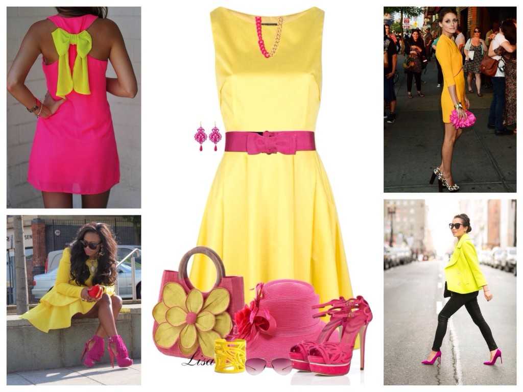 С жёлтым цветом гармонирует фуксия, а с оранжевым – классический либо голливудский вишневый оттенок. Одежда в такой цветовой гамме подойдёт молоденьким девушкам. Изысканно выглядят варианты, в которых используются дополнения белого тона. Например, поверх белого платья надевают ярко-розовый жакет, дополнить оранжевыми туфлями и сумочкой. Либо жакет носят с жёлтой юбкой и белой блузкой.