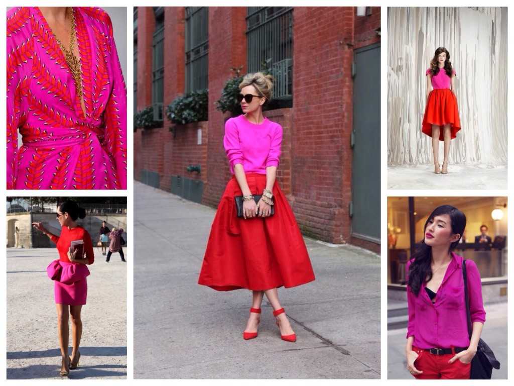 На фото мы видим, как интересно выглядят вместе оттенки фуксии и красного. Не стоит думать, что столь яркое сочетание неуместно! Просто не забудьте разбавить образ аксессуарами нейтральных оттенков. К такой комбинации очень подойдут черные туфли и сумка.