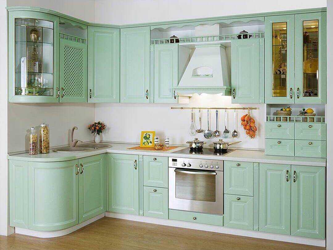 Так как фисташка родом из пастельной палитры, первое применение, приходящее на ум — прованс. При словосочетании «фисташковая кухня» представляются деревенские мотивы, светлые резные фасады, деревянная столешница и техника в ретро-стиле.