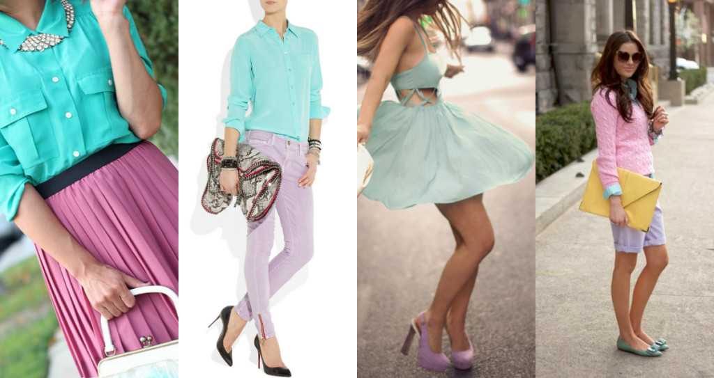 Как пример: светло-голубые джинсы, нежно-розовая майка, удлиненный мятный жакет без пуговиц и сиреневые сумка и босоножки. Или мятное платье, персиковое кимоно и аксессуары бледно-желтого, лимонного цвета.