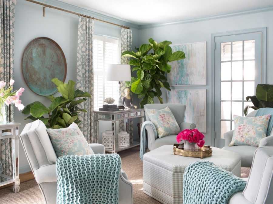 К такой нежной базе прекрасно подойдут жизнерадостные и сочные детали. Ярко-оранжевые подушки в голубую полоску, зеленое одеяло в белый горошек, пушистый ярко-голубой коврик, разноцветная броская картина или желтые шторы. Будет стильно и очень необычно! Не забудьте про статуэтки, вазочки, красные или оранжевые цветы, мягкие игрушки. Такая гостиная будет поднимать настроение после каждого рабочего дня, а гостей из нее будет невозможно отправить по домам!