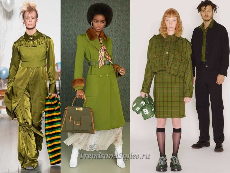 Зелёный цвет – противоположность красного. Он символизирует надежду, свежесть, спокойствие, стабильность, умиротворение, юность, гармонию, пробуждение и жизнь. Для человеческого глаза зелёный цвет — самый привычный и комфортный, ведь землю наполняет зелёный цвет: листва, трава, растительность, лес. Зелёный цвет успокаивает, лечит нервы и усталость. Конечно, есть и другое мнение о зелёном, иначе не появилось бы такое выражение, как «тоска зелёная», но такое перенасыщение может случиться с любым цветом, если его слишком много. Некоторые люди воспринимают зелёный цвет как слишком спокойный и пассивный. В одежде осенне-зимнего сезона 2018 лучшего цвета не найти, если вы хотите доверительно посидеть с друзьями или расположить к себе человека. Самый природный из всех цветов богат разнообразными оттенками: от легких, освежающих, до насыщенных, глубоких, которые прекрасно комбинируются с другими цветами. Правильно подобранное сочетание оттенков позволит создать гармоничный образ. Затемненные оттенки зеленого: изумрудный и бутылочный – цвета изысканных и роскошных образов, которые неплохо подходят для офисных костюмов. Темно-зеленый с добавлением коричневого или серого, является основным стилей «милитари», «сафари» и «кэжуал». В качестве рекомендации для модниц следует отметить, что теплые оттенки зеленого больше подходят светловолосым девушкам, а холодные – загорелым брюнеткам.