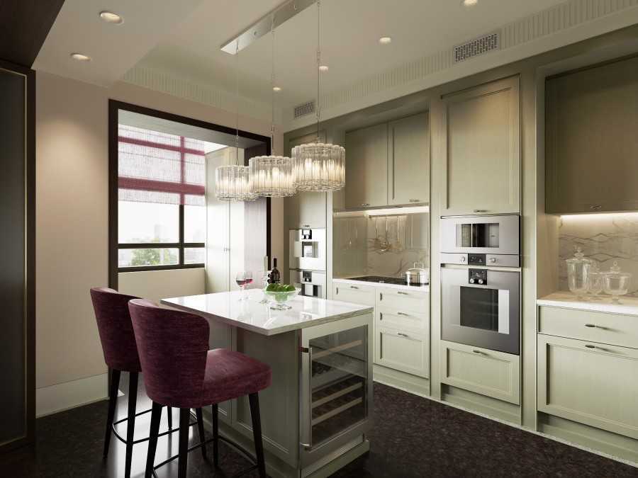Секрет благородности молочно-белого в том, что его сложно достичь, следовательно, его производство не из дешевых. А дорогая краска пойдет к дорогому материалу. Кухонный гарнитур, поддерживающий стилистику классицизма тоже не будет из категории бюджетных. Да и для маленькой кухни он не пригоден, так как стиль требует простор и высоких потолков. Так, в такой кухне на американский манер можно разместить разделочный стол, одна сторона которого будет использоваться как барная стойка. Подберите к ней высокие стулья в этом же стиле с контрастной пятнистой обивкой. Над столом небольшие навесные светильники. Аксессуарами в такой кухни могут служить фарфоровые вазы, статуи из бронзы или под золото. Пол – доска с четким рисунком.