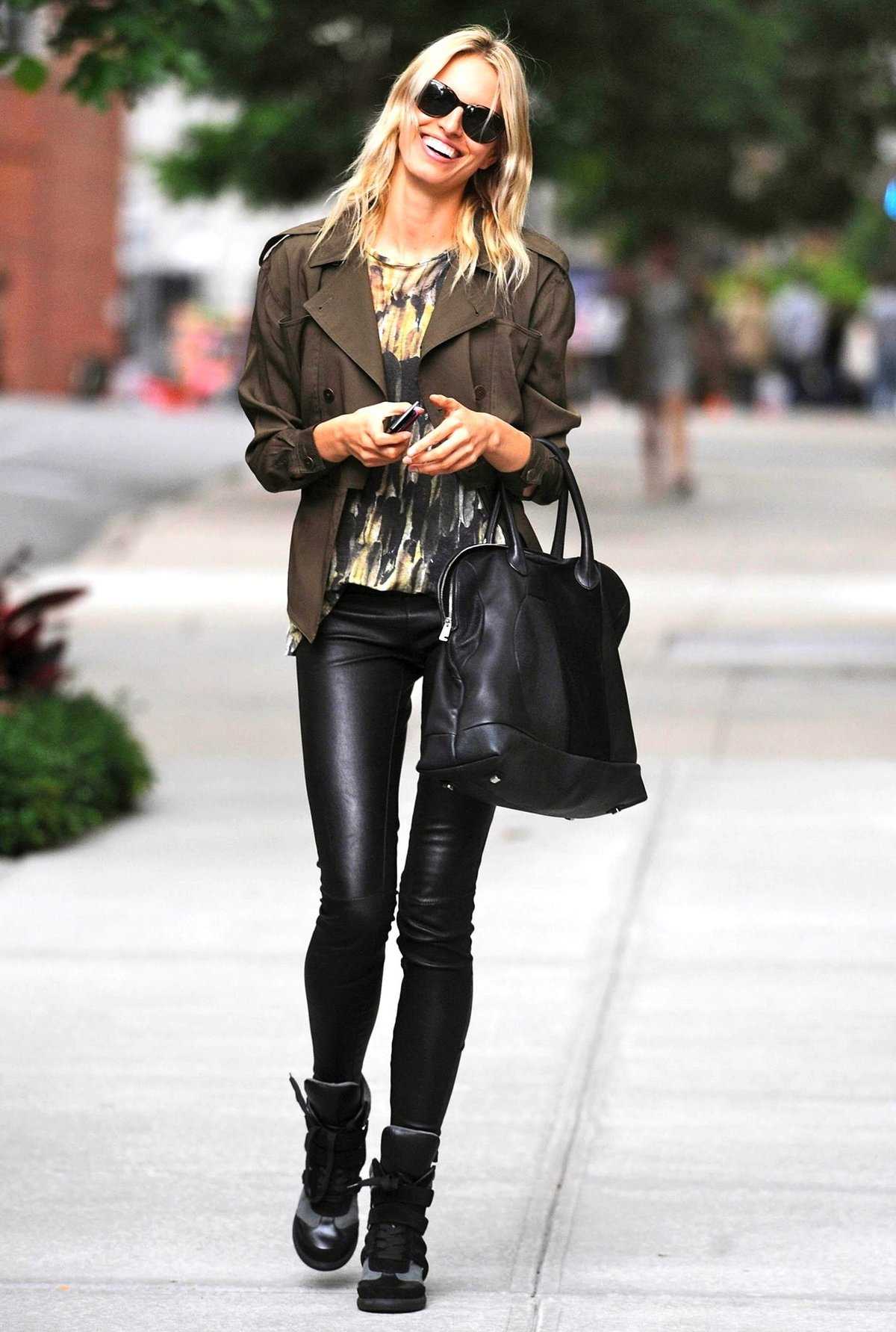 Всё те же нью-йоркские модницы щеголяют зимой в лодочках и босоножках, дополняя ими кожаные брюки, шубы и плотные куртки. Этот прием можно брать на вооружение, когда к нам приходит теплый апрель. Вместе с классическим тренчем к брюкам из кожи можно выбирать кроссовки винтажных моделей или устойчивые ботильоны. В холодное время года на смену кедам и изящным туфлям придут армейские ботинки на шнуровке и сапоги-казаки. Эффектный ход — сочетать темные кожаные брюки с контрастными белыми или цветными туфлями, а особого лоска можно добиться, надев брюки вместе с обувью нейтрального оттенка.