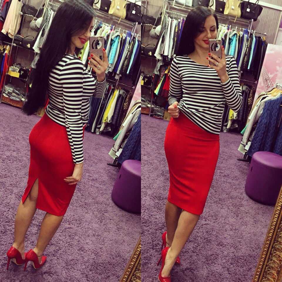 Не стоит выбирать слишком короткую юбку. Юбка-карандаш выше колена сделает ваш силуэт визуально приземистым и грузным. Ваша длина – до середины голени, если есть проблемы с полнотой ног или до середины колена, если ножки стройные.